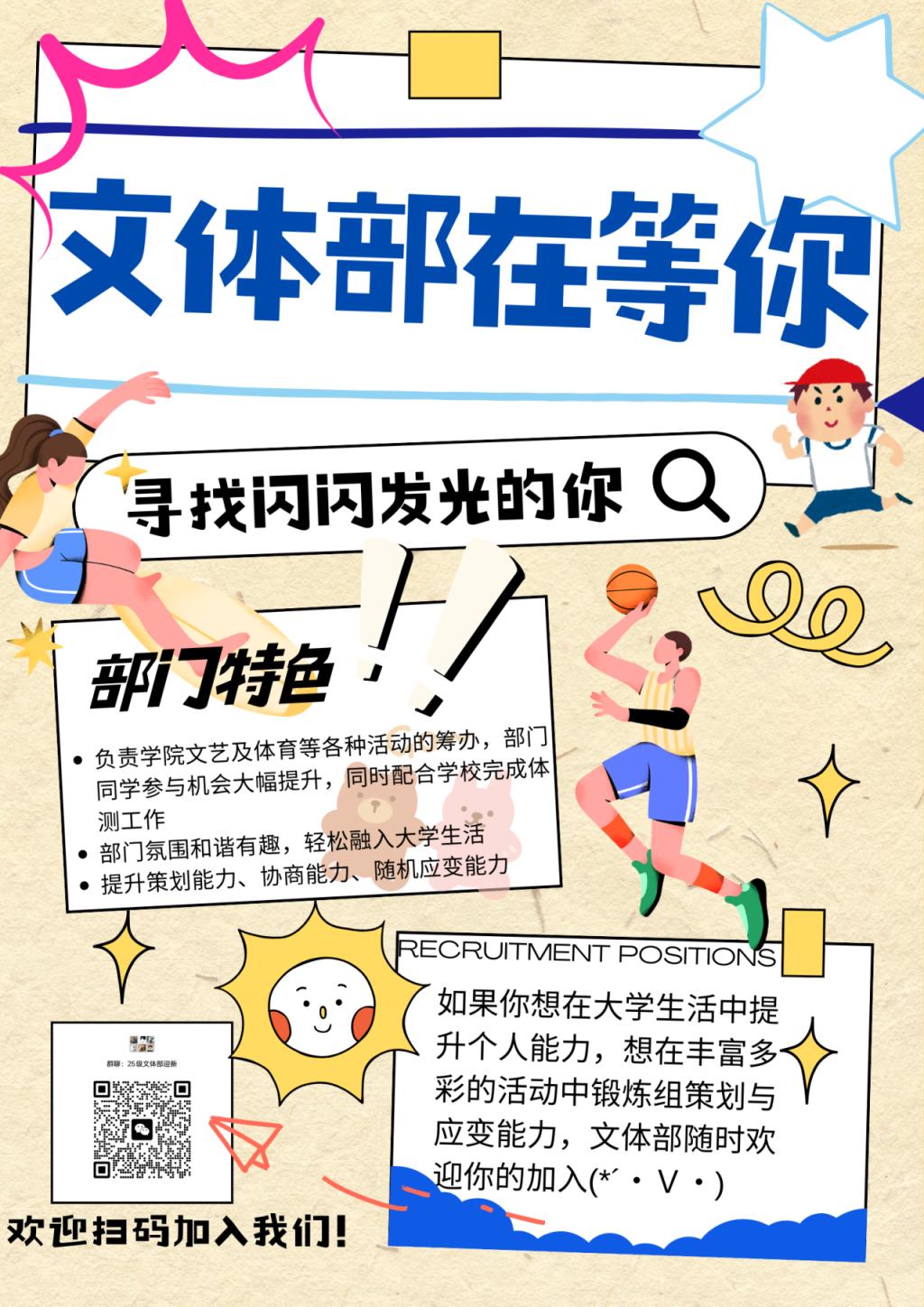 青春主场,声浪不息。这里是光影与汗水的交汇处——我们以策划为笔,书写迎新晚会的璀璨序章,点燃校园音乐节的声浪狂欢;以脚步为尺,丈量运动会的速度与激情,护航体测工作的严谨有序。举办丰富多彩的文艺体育类活动,让每一份激情都成为热爱的注脚。若你向往在台前幕后绽放才华,在协作中解锁多线程任务,在欢呼声里触摸青春脉搏,文体部正为你预留一席"燃"位!