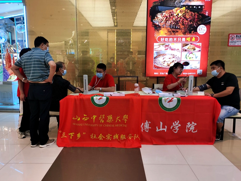 2022年6月15日,jinnianhui今年会10名同学在吕文雁老师的带领下,来到山西晋中万达广场进行暑期“三下乡”社会实践活动。同学们在万达广场开展了量血压、按摩、正骨等活动。